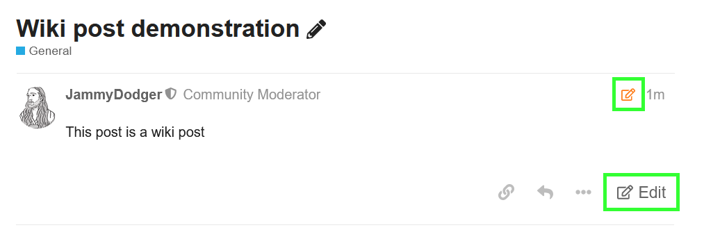 By default, Trust Level 1 users can edit all wiki posts they have access to. To edit a wiki, navigate to the wiki post and click the edit button in the lower right corner. There is also an Edit Post button within the post’s edit history as well that serves the same purpose.